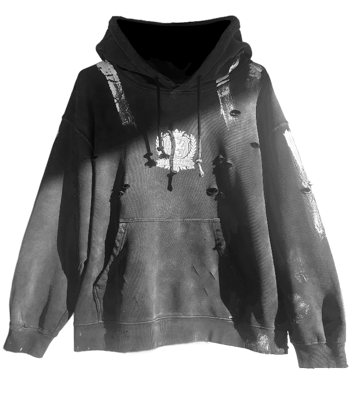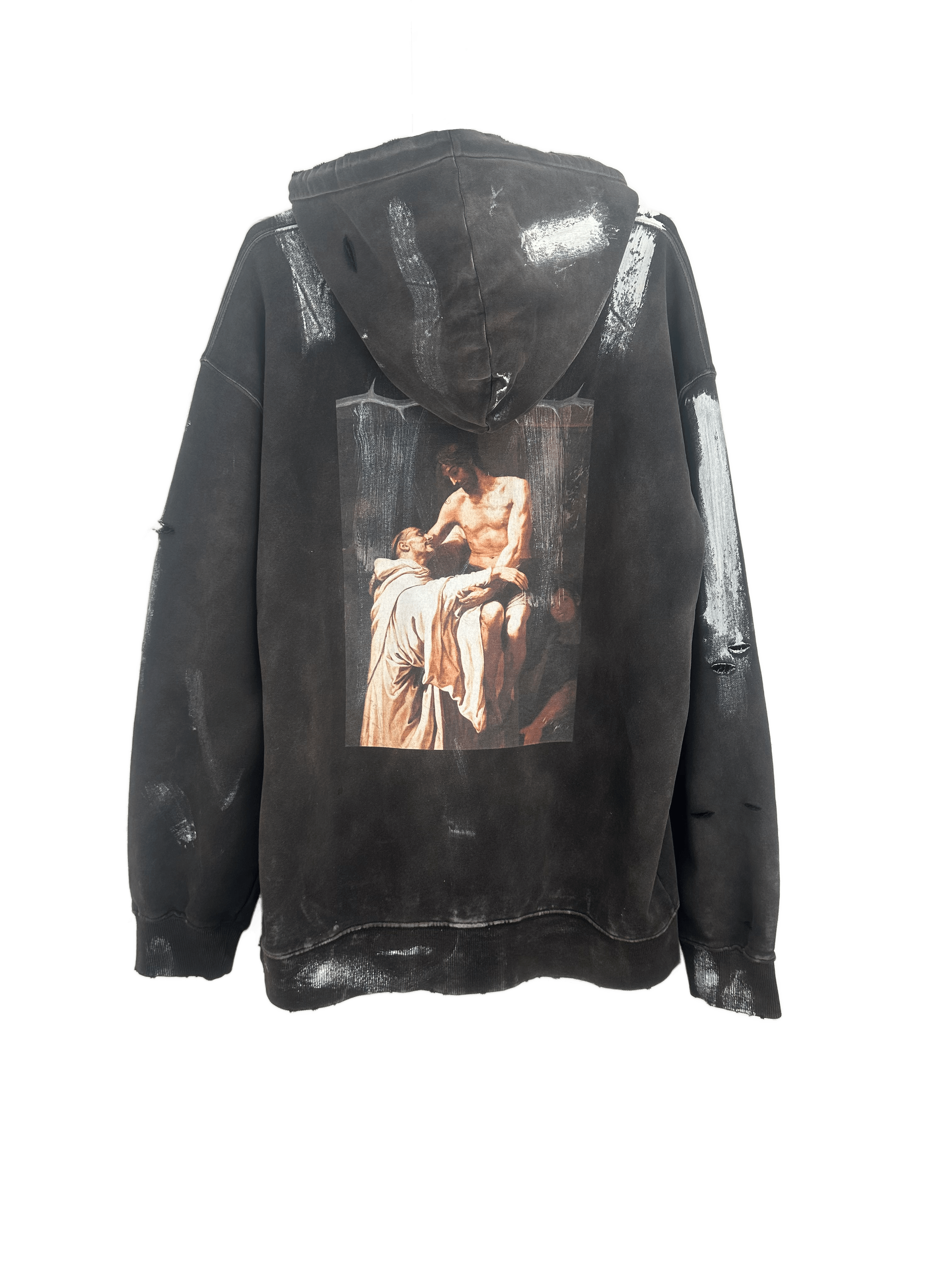 The Christ Sweatshirt transforms sacred imagery into a modern relic of rebellion. Crafted in heavyweight cotton with an oversized silhouette, its distressed edges and painted strokes channel raw defiance. The rear carries Ribalta’s Christ Embracing Saint Bernard (1625–1627)  a vision of divine mercy colliding with earthly struggle. Each garment is hand-finished in house.